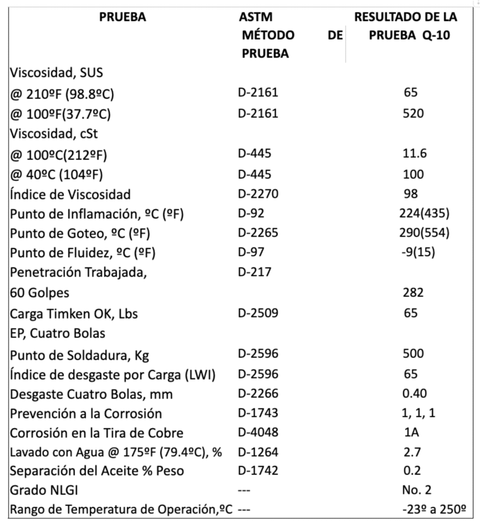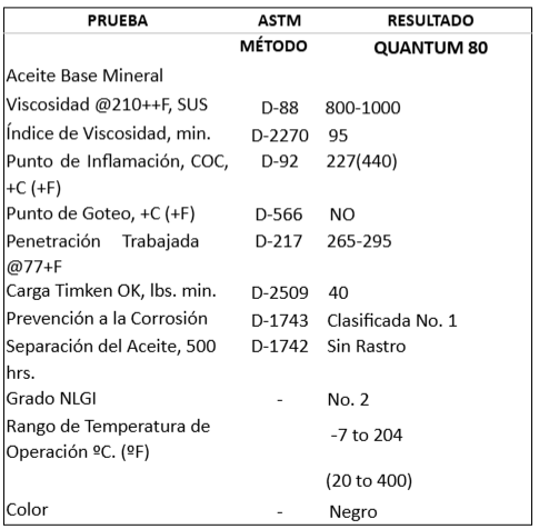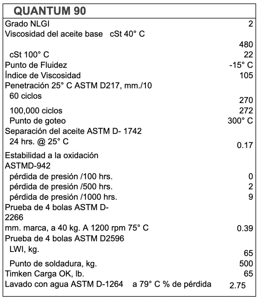 En pruebas de laboratorio Quantum 90 no muestra cambios de consistencia después de haber sido sometida a más de 100,000 ciclos en la prueba de estabilidad mecánica. También cuenta con un punto de goteo de +300° C. por lo que el rango de temperatura de operación va de -13° a 240° C. Siendo esta una grasa sumamente versátil es posible eliminar muchas otras grasas de su inventario y utilizar una sola para gran número de aplicaciones.