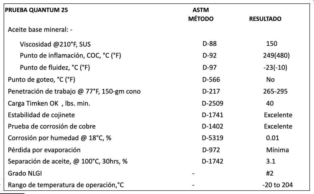 Quantum 25 es una grasa sin punto de goteo, con una resistencia a temperaturas arriba de 260°C. Las grasas ordinarias tienen un punto de goteo inestable debido a que conforman las grasas tipo “jabón”, que se deterioran rápidamente bajo condiciones de alto calor. Quantum 25 sin embargo, contiene suplementos sólidos y altamente micronizados que son imposibles de fundir proveyendo un “transportador” para el aceite base. Estos aseguran que Quantum 25 permanezca estable a temperaturas extremas. Las grasas ordinarias no pueden con cambios de temperatura y se funden a temperaturas menores a 250°C. Quantum 25 es más que solamente un lubricante resistente a temperatura. Protege de la oxidación que se da a temperatura elevada. Su aceite base es de un alto índice de viscosidad lo cual evita que la grasa se seque cuando es sometida a trabajos constantes de alta temperatura y le permite fluir en temperaturas bajas.