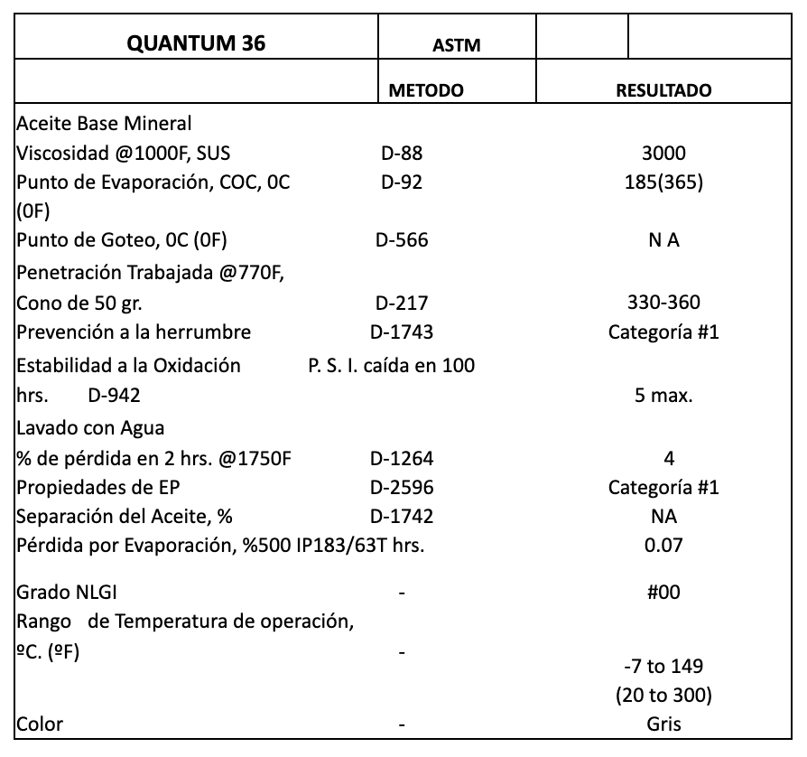 Quantum 36 no se adelgaza y mantiene el grado NLGI 00 aún después de ser sometida a trabajo constante.
