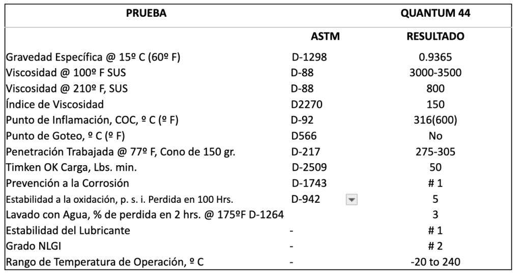 Quantum44 es una grasa compuesta de materiales sintéticos para soportar temperaturas extremas de operación. Generalmente cuando una grasa es sometida a trabajos de temperatura alta constante, esta se seca y forma residuos peligrosos de carbón que en un momento dado podrían detener su equipo, lo cual sería costoso e ineficiente. Quantum 44 contiene aditivos anti-desgaste y de extrema presión para proteger sus equipos en las mas rudas condiciones de trabajo. Quantum 44 no se goteará ni se desplazará al exterior de sus rodamientos dejándolos desprotegidos. Su fluído base de alto índice de viscosidad le proporciona la fluidez necesaria para un amplio rango de temperaturas de operación.