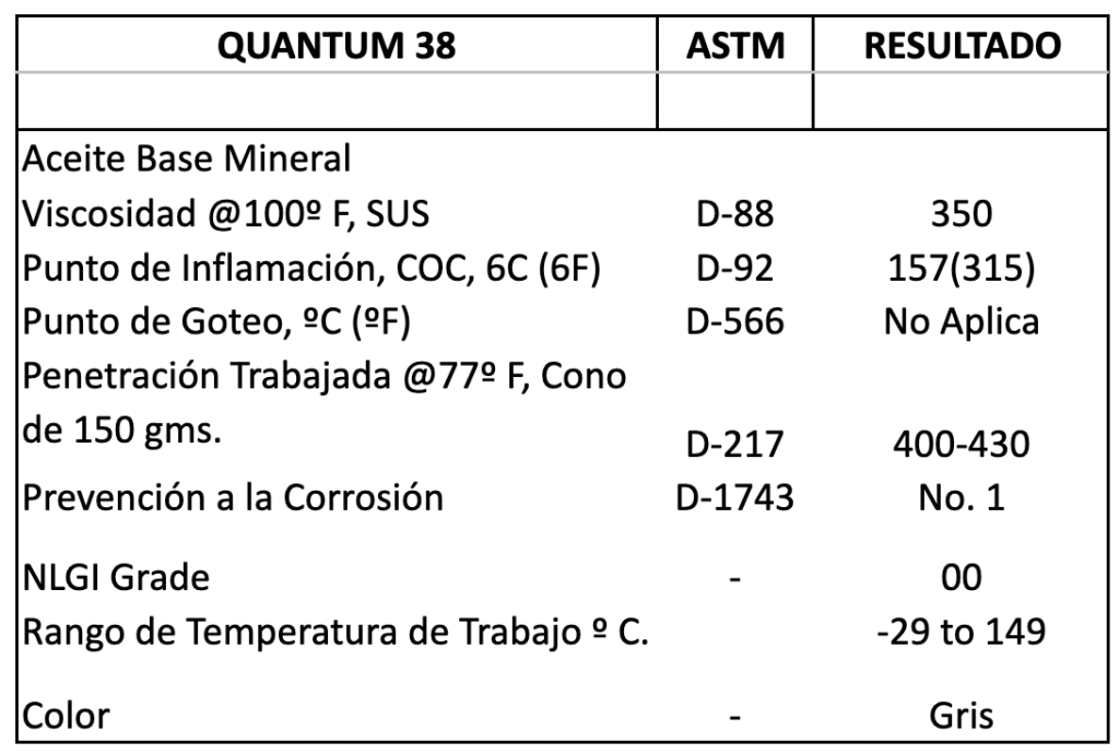 Super grasa para lubricar cadenas y cables de acero en la industria. Alto contenido de aditivos especiales hacen de Quantum 38 una grasa excepcional para penetrar en los lugares más estrechos como las cuerdas de los cables de acero. Además está constituida de materiales especiales como el disulfuro-molibdeno que le dan propiedades de extrema presión para proteger las partes sometidas a fricción. Quantum 38 es una grasa que se mantendrá en posición gracias a su extraordinaria propiedad de agarre. Por lo tanto no será necesario re-lubricar con la frecuencia de las grasas comunes. Cables y cadenas que trabajen a la intemperie serán protegidas del polvo y la lluvia alargando así su vida útil obteniendo así grandes ahorros. También es útil en diversas aplicaciones industriales como engranes y rodamientos donde su excelente fluidez le permite ser aplicada en sistemas centralizados de lubricación.